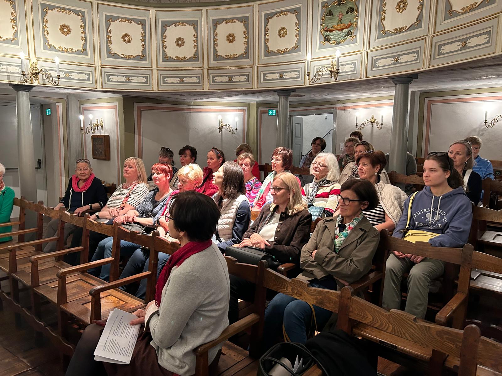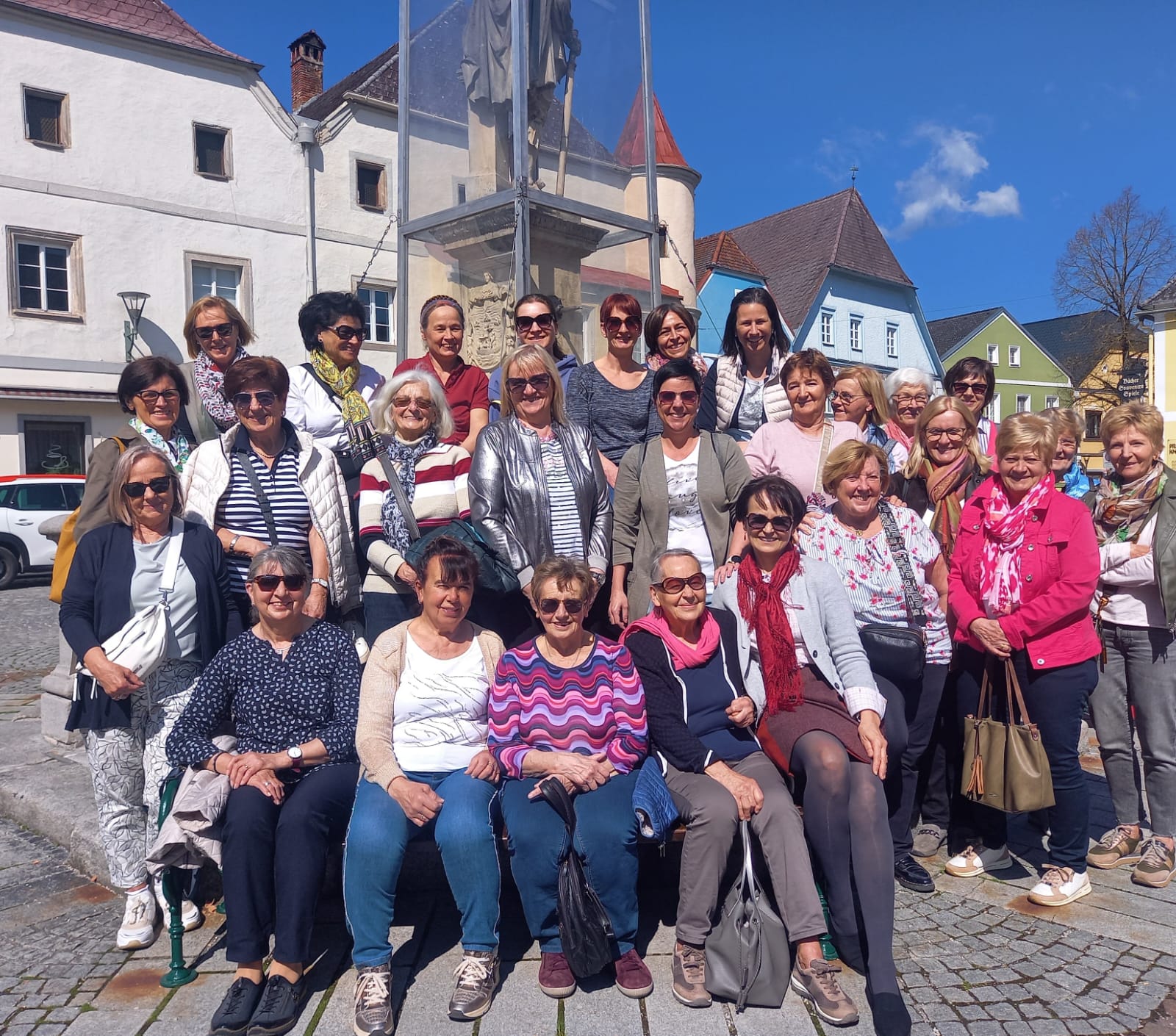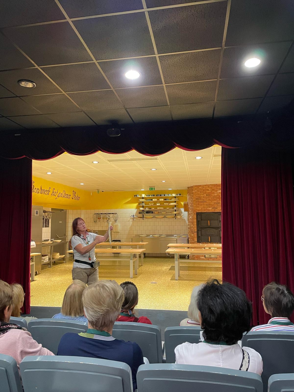 Zu Mittag ging es weiter nach Grein, wo wir für das Essen beim Schörgi einkehrten. Nach einer Stärkung besichtigten wir das historische Stadttheater. Im Zuge der Führung konnten wir den Kostümfundus, den Backstage-Bereich und natürlich den Theatersaal selbst sehen. Bis heute werden im ältesten bürgerlichen Theater Österreichs noch Aufführungen gemacht – unter anderem von uns Goldhauben an diesem Nachmittag. Mit einem Kanon von uns Damen erfüllten wir den Theatersaal mit Gesang.