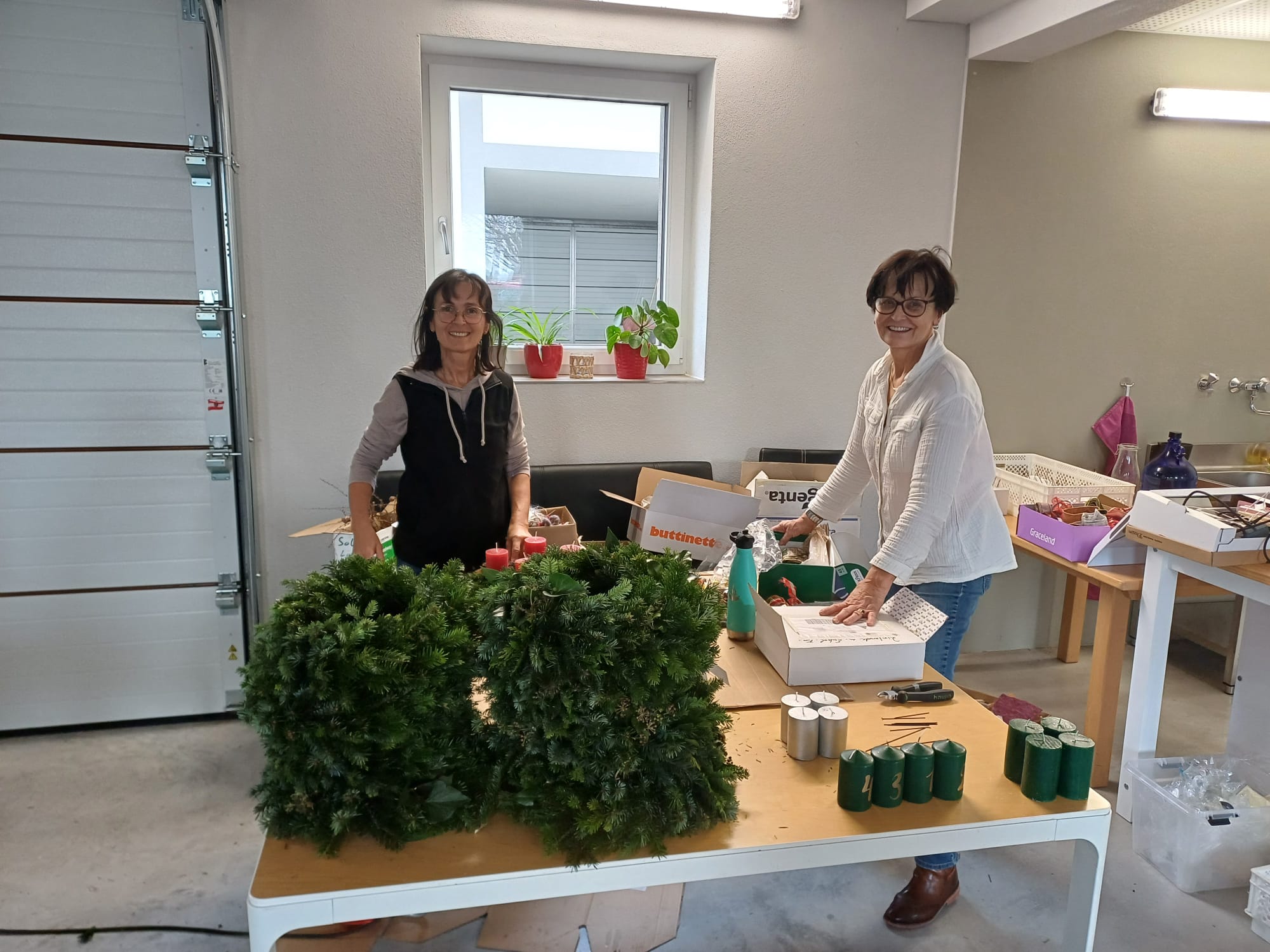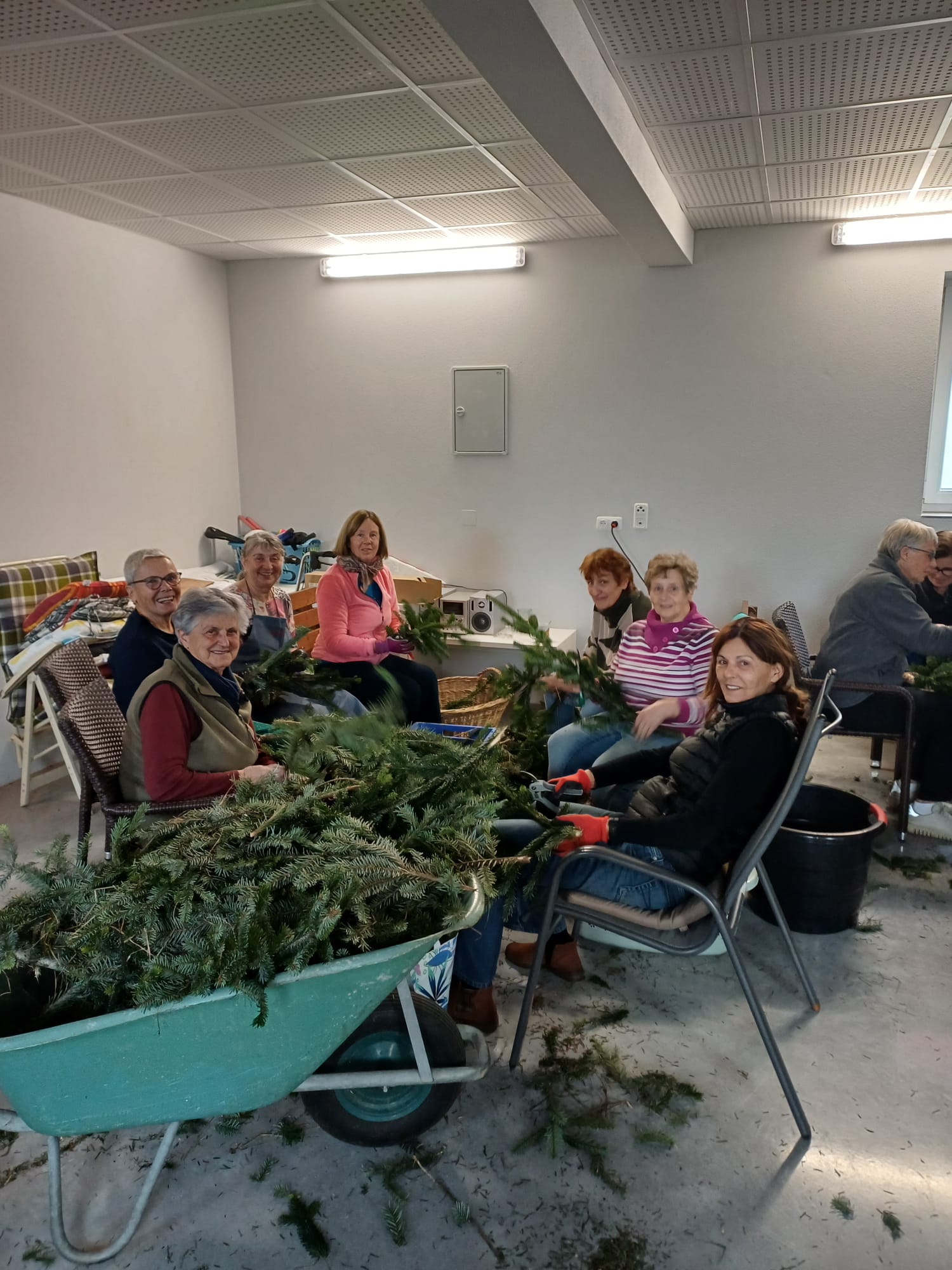 Ausgestattet mit Gartenhandschuhen und -Scheren versammelten wir uns bereits am frühen Nachmittag bei Fam. Kallerstorfer, um Adventkränze zu binden. Egal ob reichlich geschmückt oder ohne Deko – jeder Kranz wurde ein Unikat. Ganz nach dem Motto „viele Hände, schnelles Ende“ wurden wir früher fertig als erwartet und genossen noch gemeinsam eine Jause.