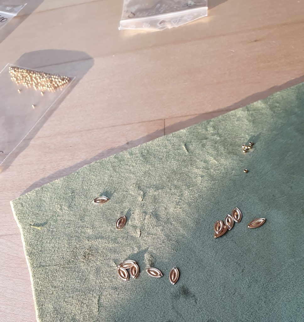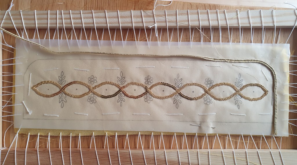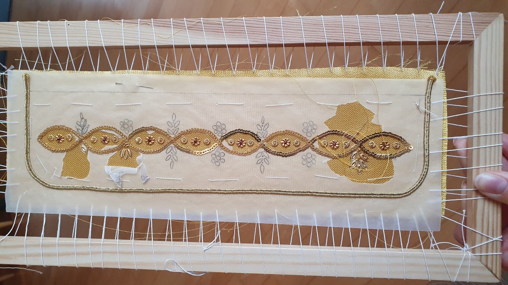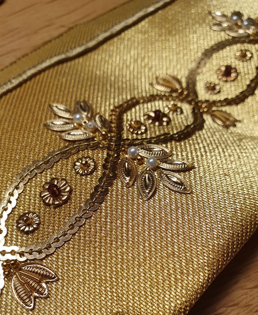 Zum Besticken wird der Stoff auf einen Rahmen gespannt. Mit Nadel und Faden werden die Materialien einzeln angebracht. Bei den Goldhauben, Bändchen und Mädchenhäubchen handelt es sich bei den Materialien unter anderem um Perlen oder Pailletten, die mit echtem Gold überzogen sind. Ebenso werden Granaten, entweder rote für die Goldstickerei oder schwarze für die Perlstickerei, verwendet. Die hochwertigen Materialien geben neben der Handarbeit dem Unikat seinen besonders hohen Wert.