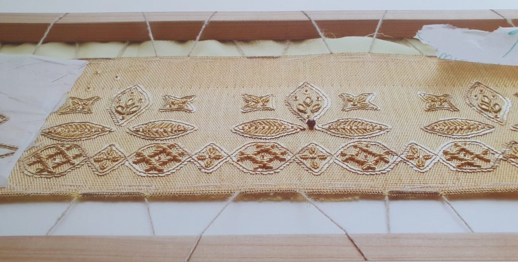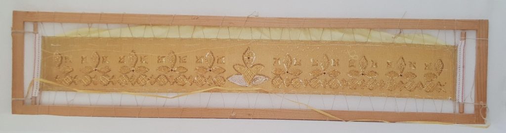 Zum Besticken wird der Stoff auf einen Rahmen gespannt. Mit Nadel und Faden werden die Materialien einzeln angebracht. Die Materialauswahl bei den Goldhauben, Bändchen und Häubchen besteht aus „Flinserl“ – Fachausdruck „Flitter“, den es in verschiedenen Größen gibt. Weiters brauchen wir die sogenannten „Folien“ zum Ausschmücken der einzelnen Motive. Auch Perlen und Spiralen stehen uns zur Verfügung. Perlen bestehen aus 18 Karat vergoldetem Kupfer. Pailletten und Flitter sind vergoldete, runde Metallplättchen. Diese werden mit Faden, kleinen Perlen oder mit einem Stück Bouillon auf dem Stickgrund befestigt. Folien sind aus Blech gestanzte, vergoldete Blüten- und Blätterformen. Bouillon ist eine aus vergoldetem Metalldraht gedrehte, dichte Spirale. Durch diese Spiralstückchen wird bei der Stickarbeit der Faden geführt. Gerne wurden und werden auch heute noch Granate, rund oder facettiert, verwendet.