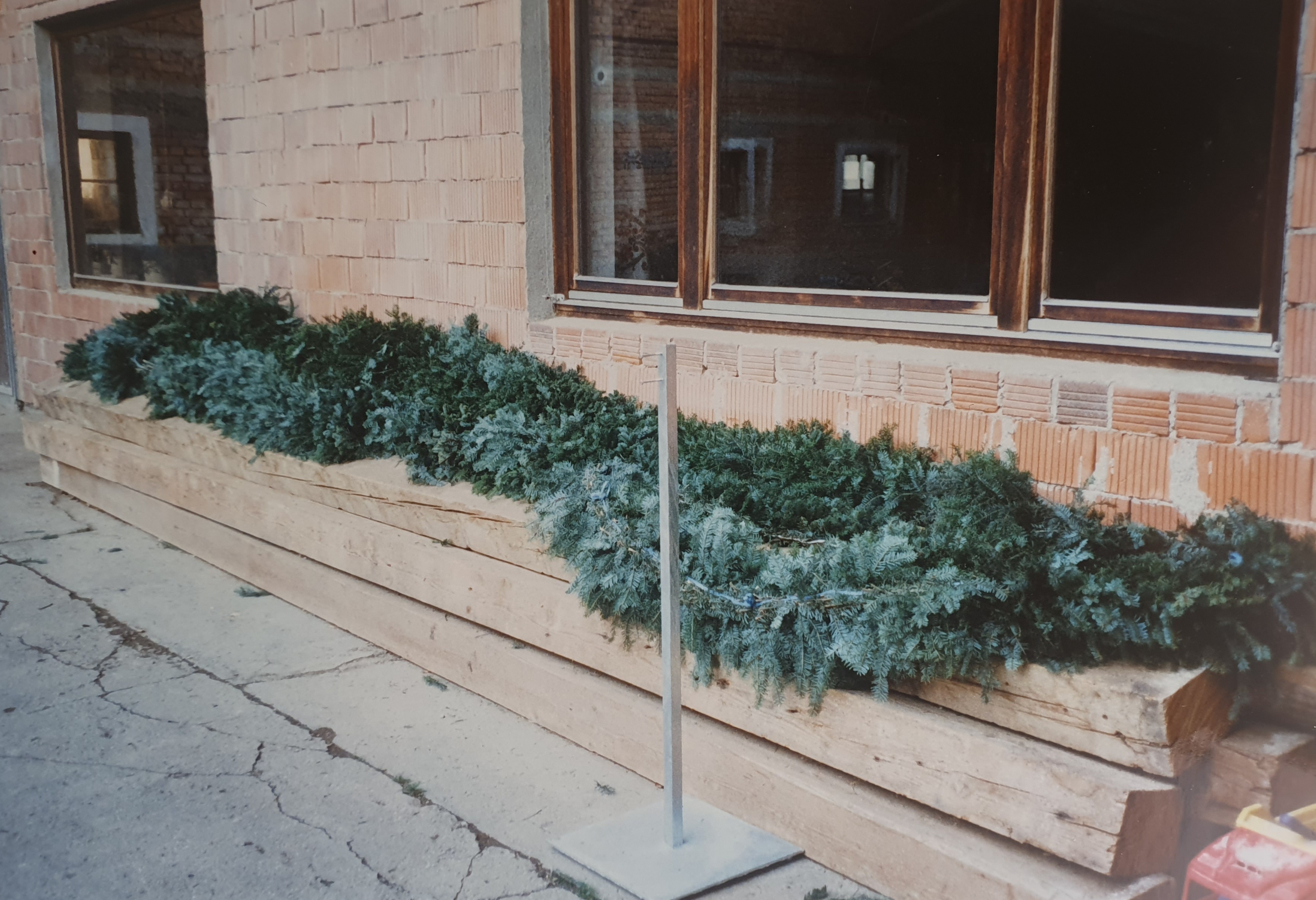 Schmücken des Brunnens mit Tannenzweigen in der Adventzeit