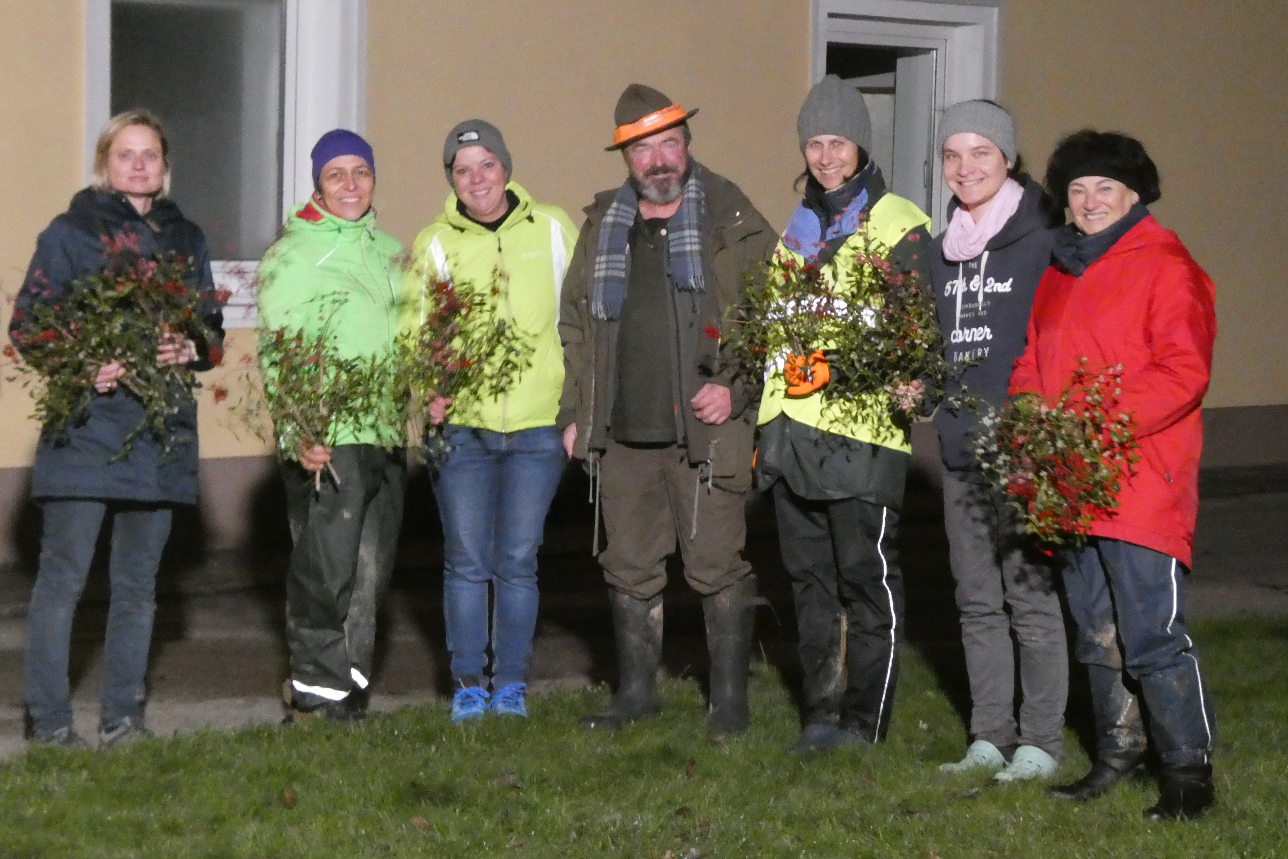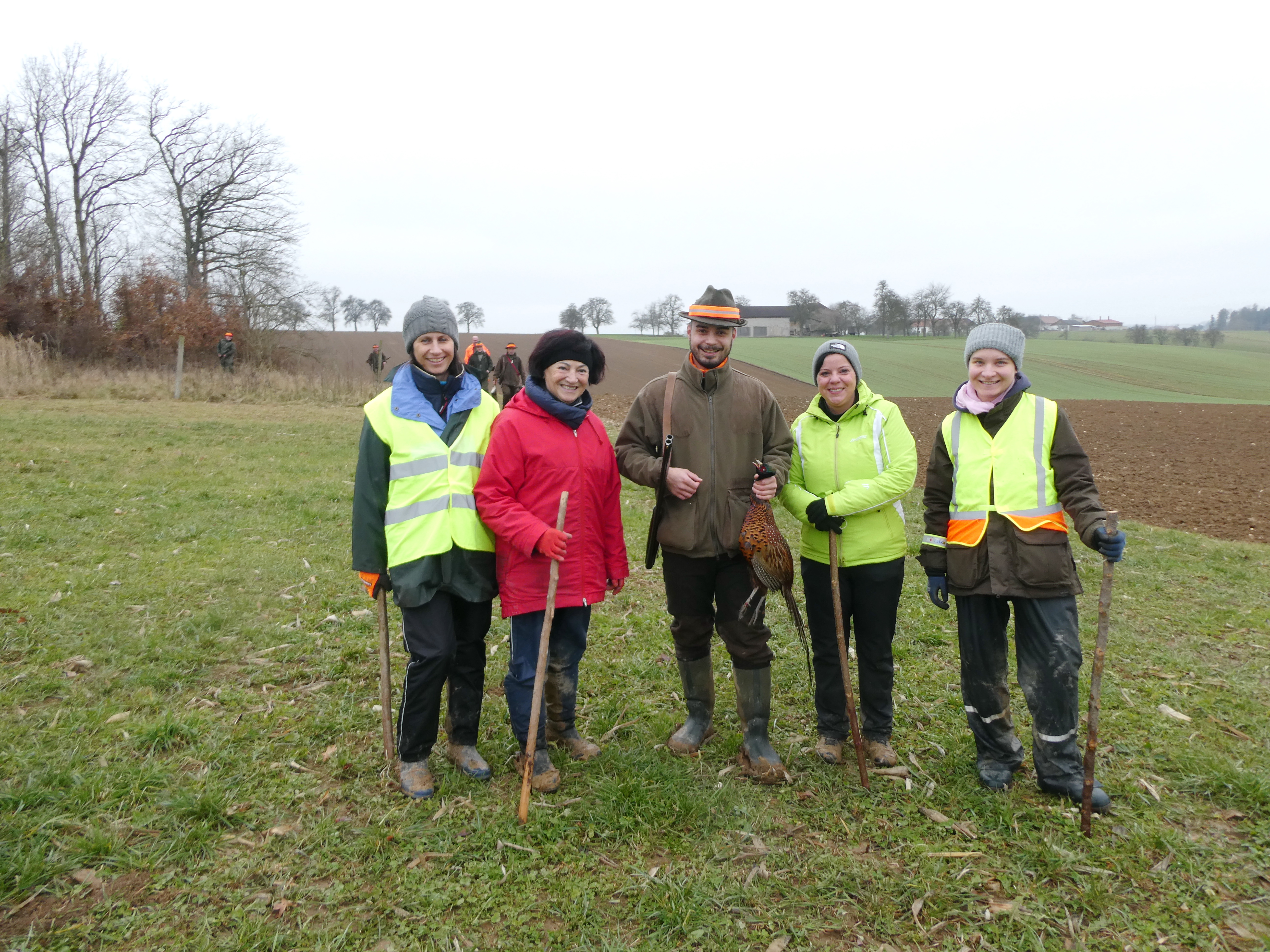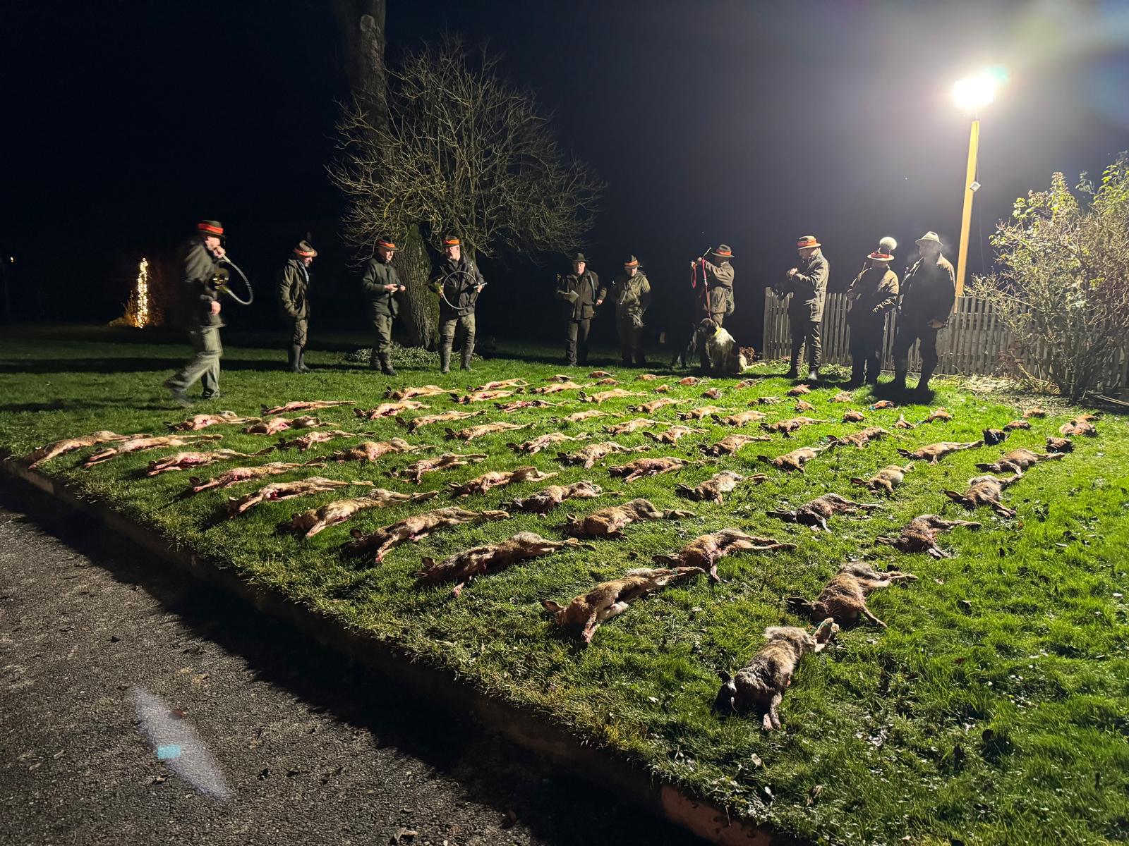 Diese Treibjagt galt als Premiere: Zum ersten Mal nahmen Damen der Goldhaubengruppe Waldneukirchen an einer der Herbstjagden teil. An diesem Tag waren circa 35 Jäger, eine Jägerin, 3 Jagdhunde und 6 Treiberinnen sowie ein Treiber im Gebiet rund um Pesendorf auf der Jagd – und das mit vollem Erfolg! Auf den 17 Kilometern Fußmarsch wurden 51 Hasen und 25 Hähne geschossen. Zum Abschluss gab es eine Streckenlegung, bei der die Jagdhornbläser mehrere Stücke spielten.