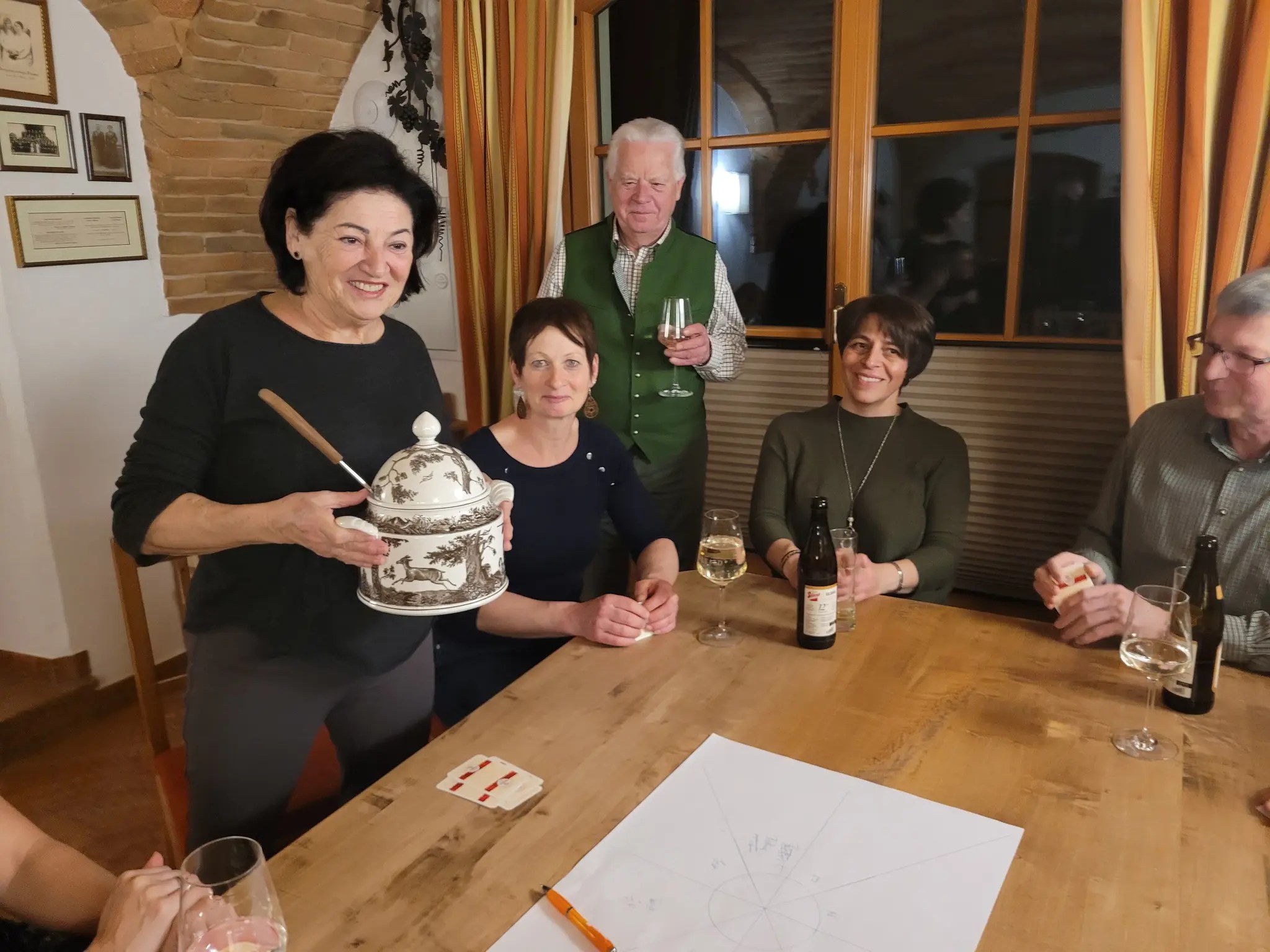 Die Treiberinnen gingen an diesem Tag aber nicht leer aus! Als Geschenk bekamen sie 4 Hasen geschenkt. Anfang des neuen Jahres lud die Initiatorin Inge Göschl die Treiberinnen sowie jene Jäger ein, die die Frauen bei der Treibjagd unterstützten. Unter anderem Robert Himmer, der vor der Jagd eine kurze Einschulung in den Ablauf gab und Manfred Freudenthaler, der nicht nur den Wildverkauf bei der Treibjagd abwickelte, sondern ebenso die Treiberstecken für die Frauen anfertigte. Beim gemeinsamen Hasenschmaus wurde das traditionelle Kartenspiel „Grea Bua suachn“ gespielt – eine lustige Methode, um die Kosten des Abendessens unter den Beteiligten aufzuteilen. Das Ziel des Spiels, welches mit Doppeldeutschen Karten gespielt wird, ist simpel: Wer die meisten Punkte hat, zahlt am meisten.