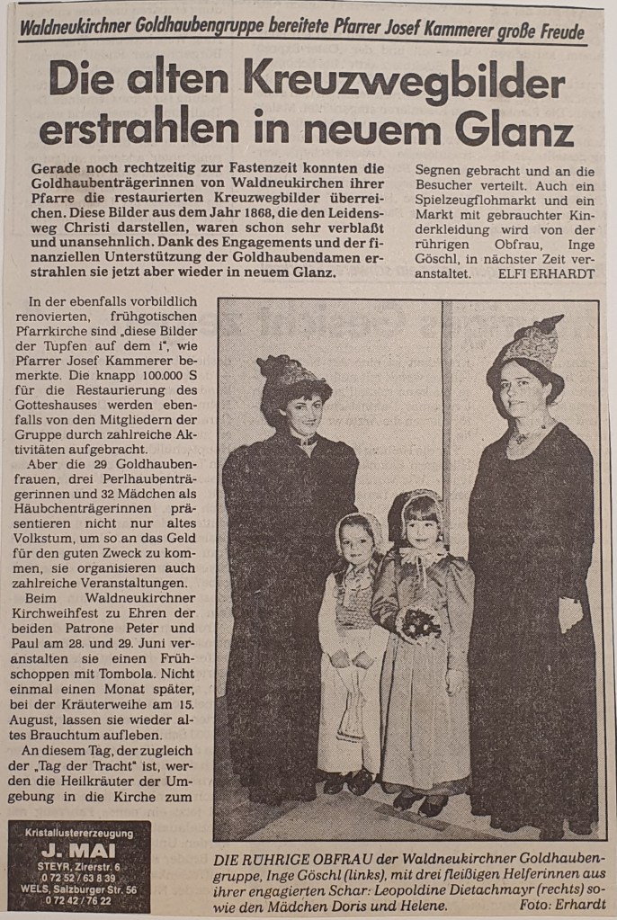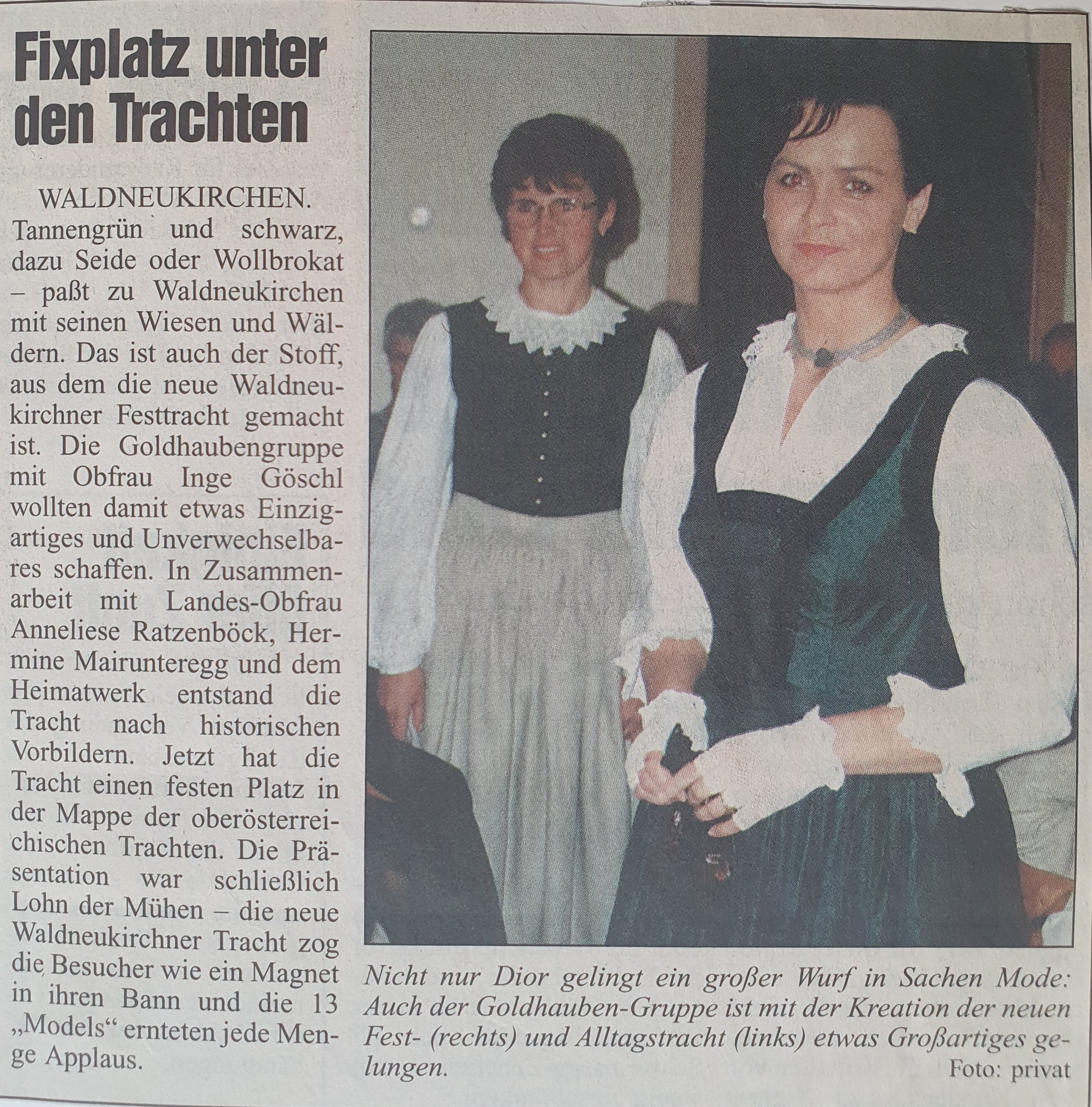 1980 schloss sich die Goldhaubengruppe Waldneukirchen dem Dachverband der Volkskultur des Landes OÖ zur Goldhaubengemeinschaft an. Am 26. Jänner 1980 wurde Frau Ingrid Kleindl aus Weyer als Bezirksobfrau des Bezirks Steyr-Land gewählt. Ihr Amt führte sie bis ins Jahr 2000. Stellvertreterin war Theresia Sonnleitner aus Aschach und Christine Eggendorfer aus Bad Hall.