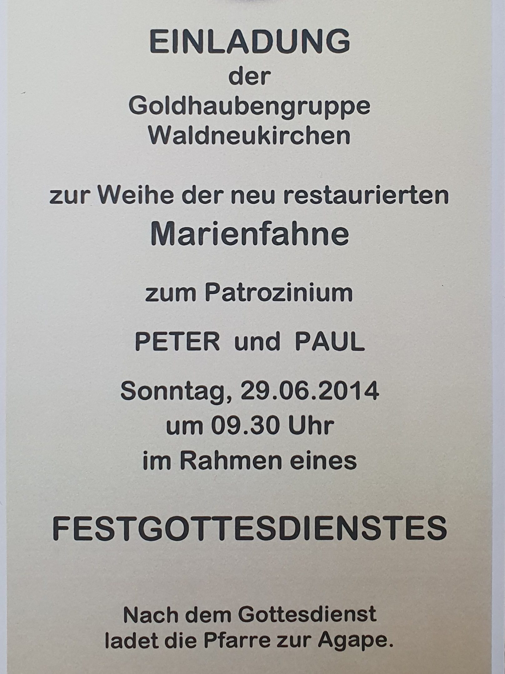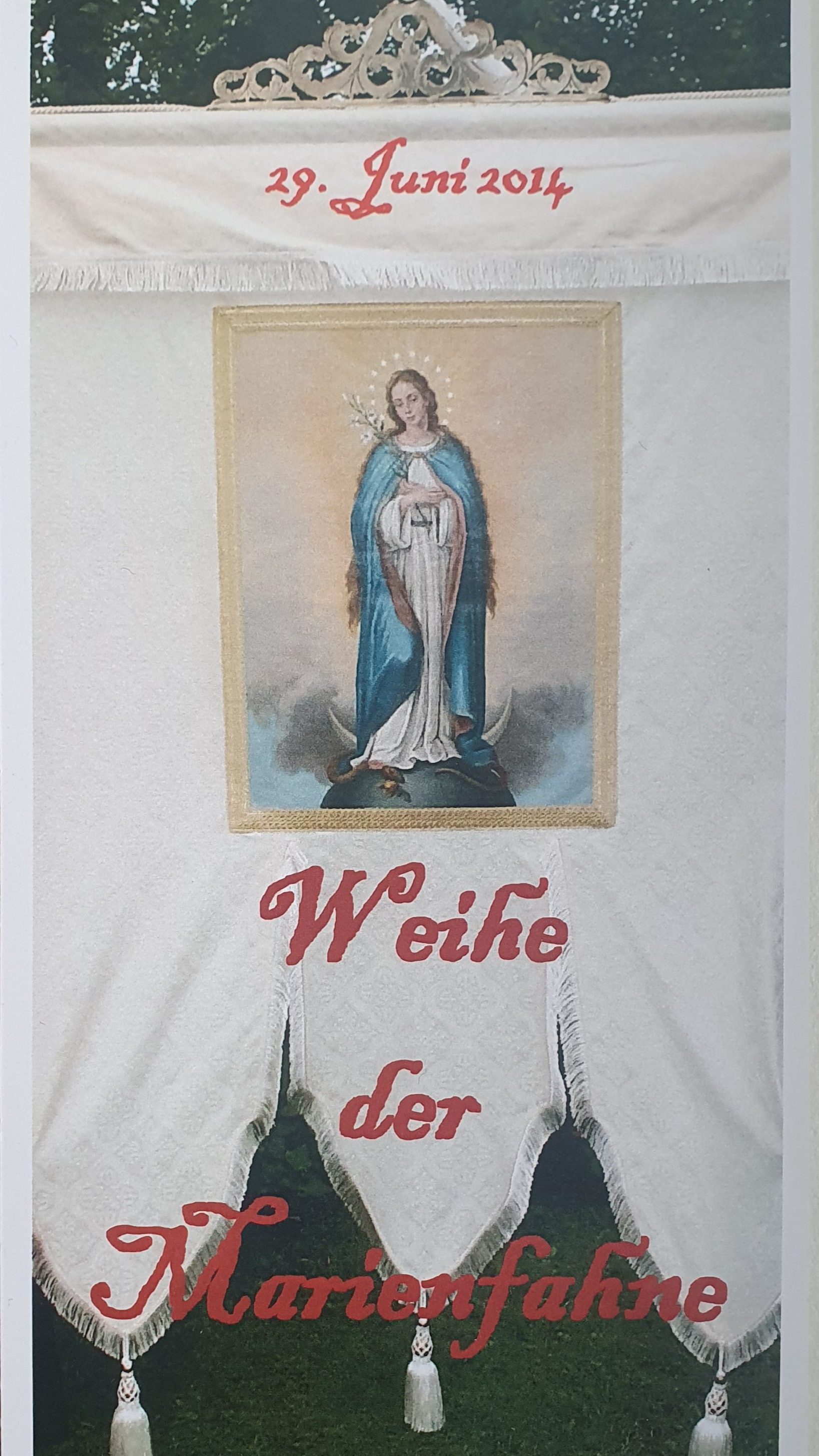 Nach langen Jahren des Dienstes wurde die Kirchenfahne neu angefertigt. Der Wollbrokat war durch den Kirchenbrand 1982 verrußt, der darauf abgebildete Engel – zu sehen auf dem ersten Bild – war ausgebleicht. Dank des Engagements der Goldhaubengruppe wurde eine neue Fahne gefertigt. Den cremefarbenen Damast schmücken Garnfransen als Einfassung, eine Goldborte zum Einsetzen des Bildes und drei Quasten. Seit der Weihe wird die Fahne von den Fahnenträgern Christian Schaupp, Franz Peter Göschl, Peter Angerbauer und Hannes Petz abwechselnd getragen.