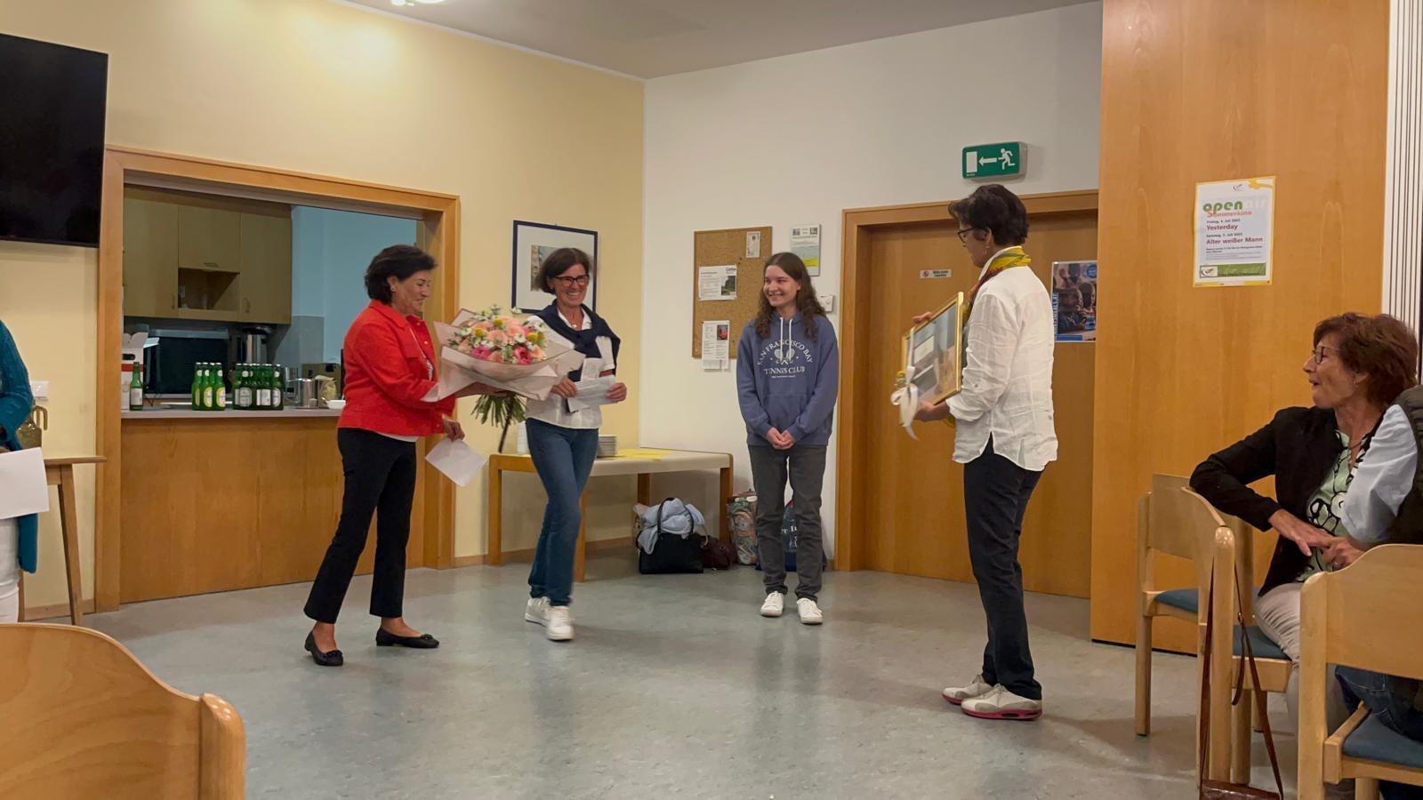 Mann links: Bgm. Florian Mandorfer, Frau mittig mit rosa Schürze: Hermine Diwald, Frau mit Geschenk: Maria Preinesberger