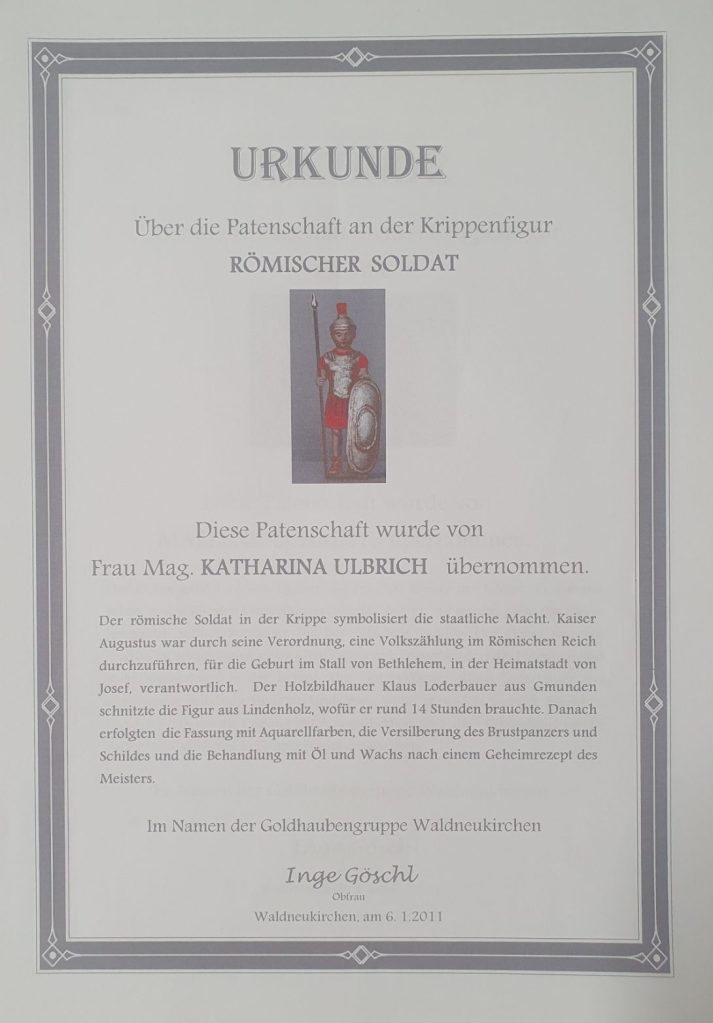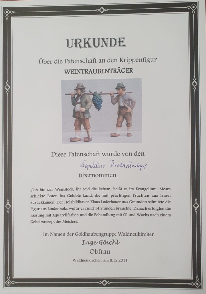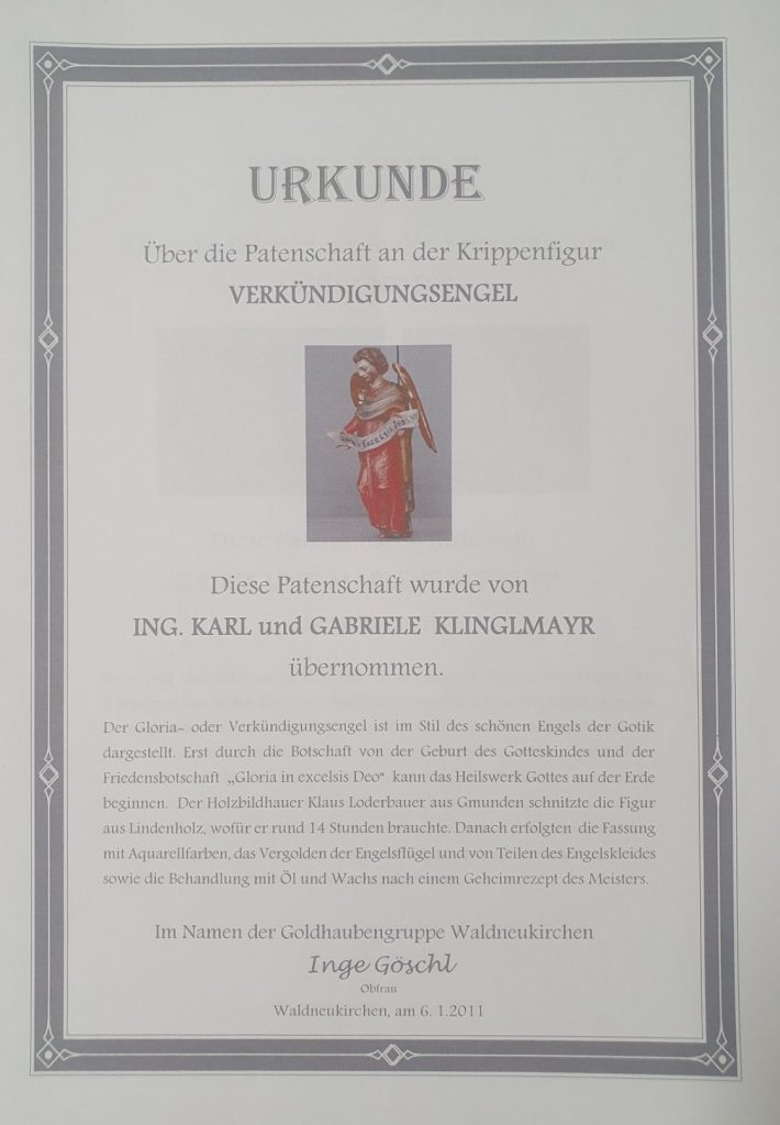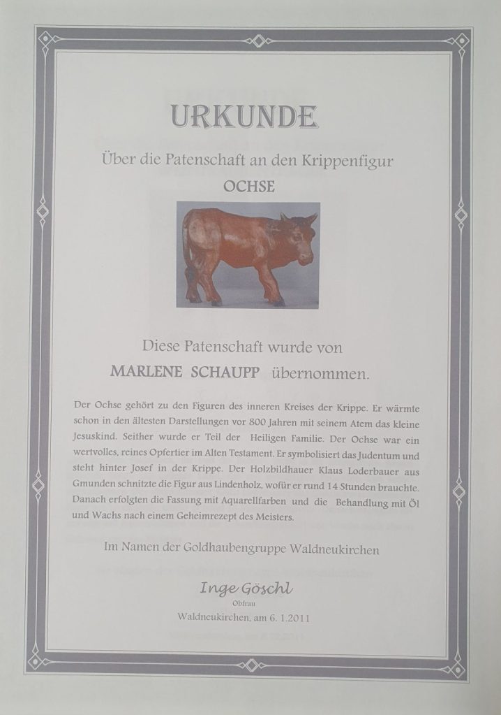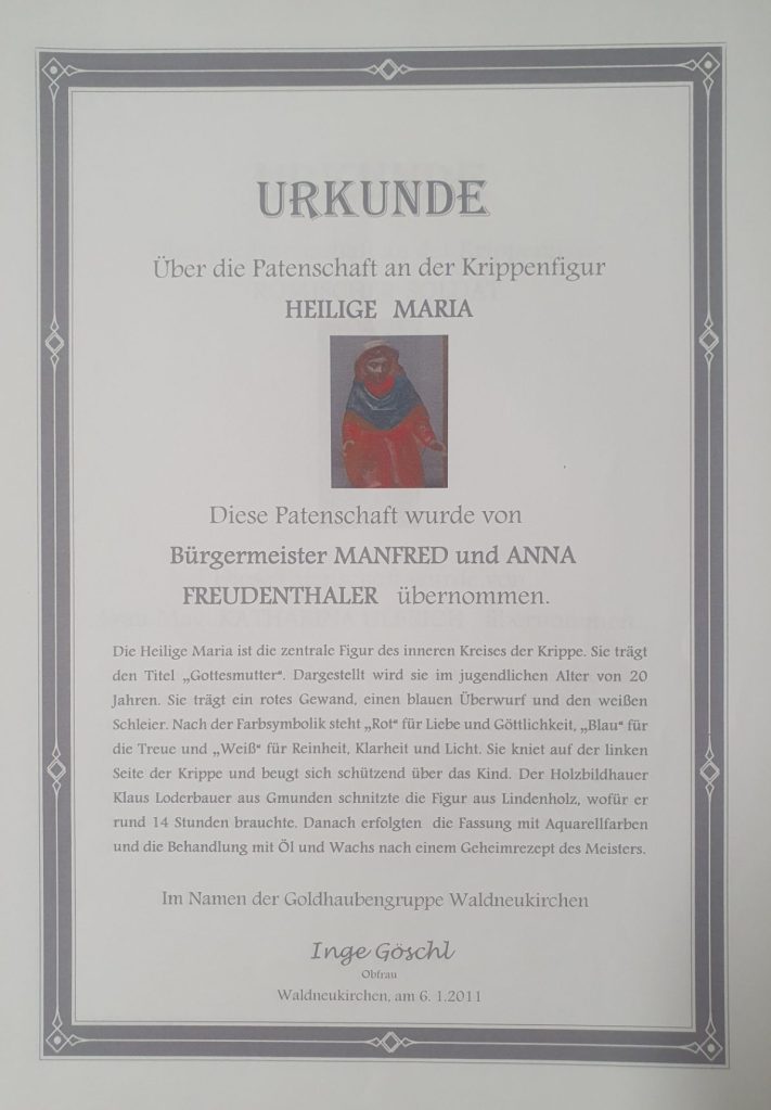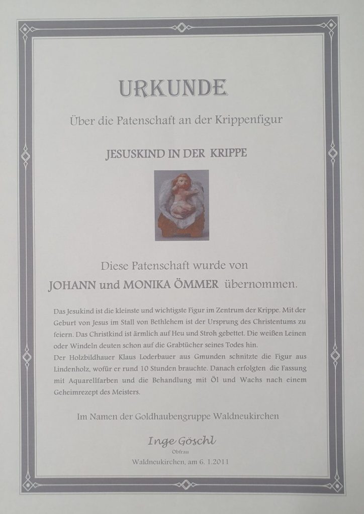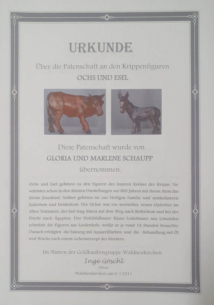 Die Gesamtkosten der Krippe beliefen sich auf rund 5.000 Euro, von denen die Mütterrunde ein Fünftel finanzierte und der Res durch die vielen Mehlspeisenverkäufe der Goldhaubengruppe abgedeckt wurde. Zudem konnten sich die Waldneukirchner Patenschaften zu den einzelnen Figuren kaufen.