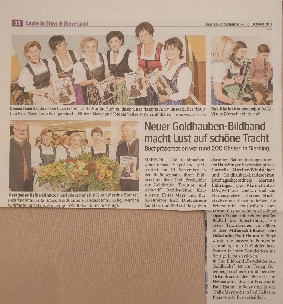 Hanne Müller, Inge Göschl, Doris Schimpfhuber, Gloria Schaupp, Marlene Schaupp, Annemarie Schimpfhuber, Marianne Dammböck, Poldi Heuberger, Renate Maderthaner, Elsa Schimpfhuber, Erni Eder, Hermine Diwald, Rosi Ganglbauer, Anna Freudenthaler, Monika Brandner, Monika Ömmer, Gabi Klinglmayr, Frieda Frantal, Hermine Gsöllhofer, Annemarie Brunner, Gerti Schneckenleitner, Anni Grafinger, Resi Geyr, Ilse Schaupp, Elisabeth Geyr2011: Fotobuch „Festkleider zur Goldhaube – Tradition und Ästhetik“